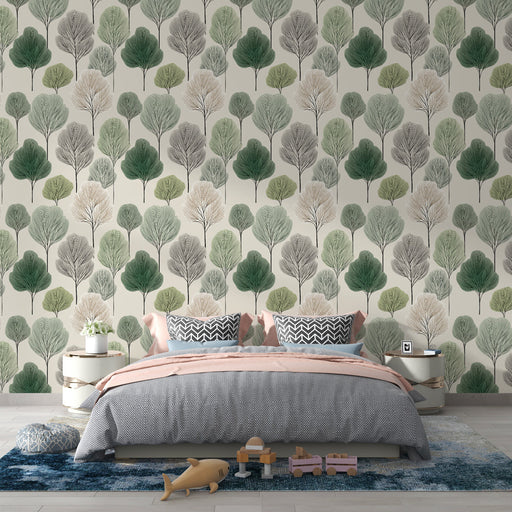 WonderMuralТапетът представя елегантен модел на разнообразни листа в нюанси на зелено, бежово и сиво, на светъл фон. Органичните форми и фините детайли на лис...