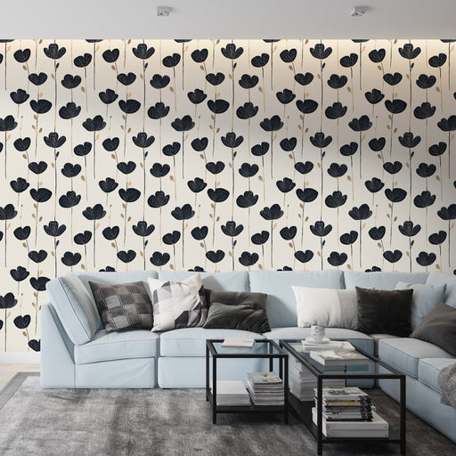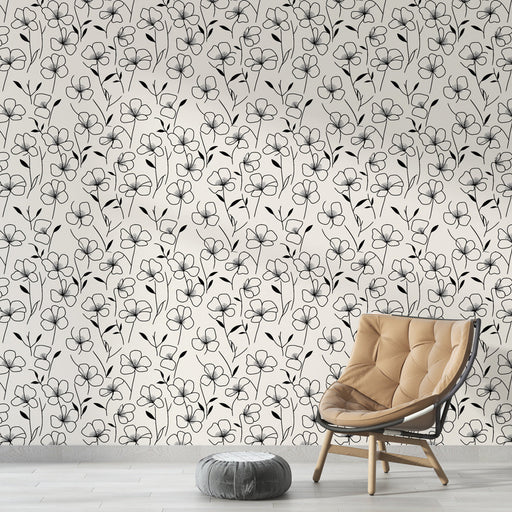 WonderMuralТапетът подчертава елегантен модел на черни цветя, деликатно нарисувани на светло бежов фон, придавайки съвременен и изтънчен акцент на вашето прос...