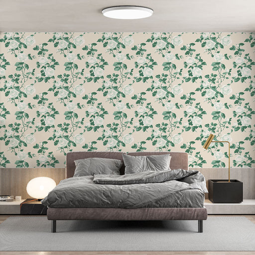 WonderMuralТапетът представлява красив модел от бели рози, заобиколени от зелени листа, създавайки романтична и елегантна атмосфера. Светлото бежово фон подче...
