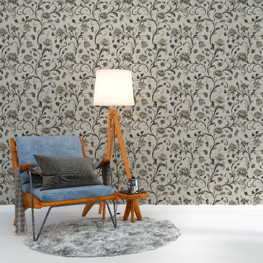 WonderMuralТапетът представя винтидж цветен дизайн с нежни модели на цветя и листа в черни и бежови тонове. Изтънчени детайли и грациозни извивки добавят допи...