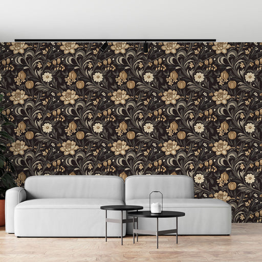 Прегледайте пълни подробностиТапет с цветя и листа в черно и бежово | Цветен и растителен модел върху тъмен фон