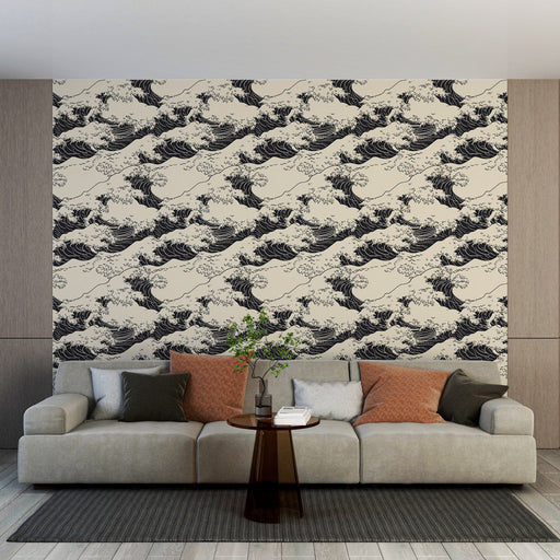 WonderMuralТапетът представя превъзходен модел на стилизирани вълни, нарисувани в черно върху мек бежов фон. Динамичната илюстрация предизвиква силата на море...