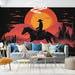 Тази завладяваща тапет включва силуета на каубой, яздещ кон, осветен от залязващото слънце в ярки нюанси на оранжево и червено. Черният фон подчертава контраста и акцентира върху стилизираните детайли на планините и кактусите, създавайки мистична западна атмосфера.