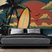 Предизвикване на слънчеви ваканции с нашата стенописна тапет, изобразяваща идилична плажна сцена. Дизайнът включва златен сърф, облегнат на пищни палми, на фона на пламтящо небе, осветено от залез. Вълните леко се разбиват на брега, създавайки успокояваща и релаксираща атмосфера.
