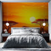 Тази пленителна тапет изобразява величествен залез над саваната, където нюансите на оранжево и жълто се преплитат, за да създадат топла и спокойна атмосфера. Силуетите на иконични дървета се открояват на фона на пламтящото небе, добавяйки усещане за дива природа и приключение към вашия интериор.