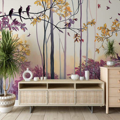 WonderMuralТапетът предизвиква цветна гора с есенни нюанси, където дървета с розови, лилави и златисти листа стоят величествено. Черните силуети на стъблата д...