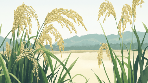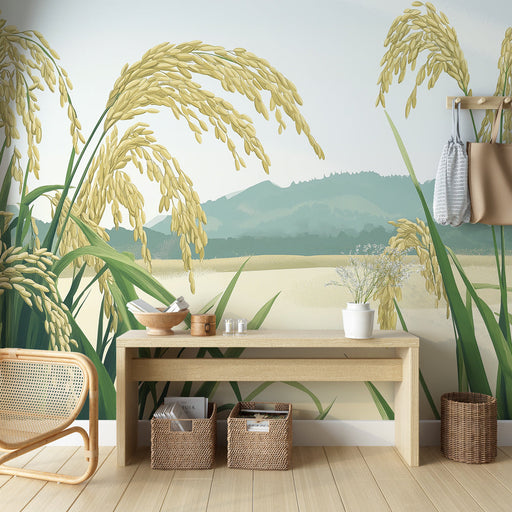 Прегледайте пълни подробностиМурален тапет ориз | Златни оризови класове и успокояващ пейзаж