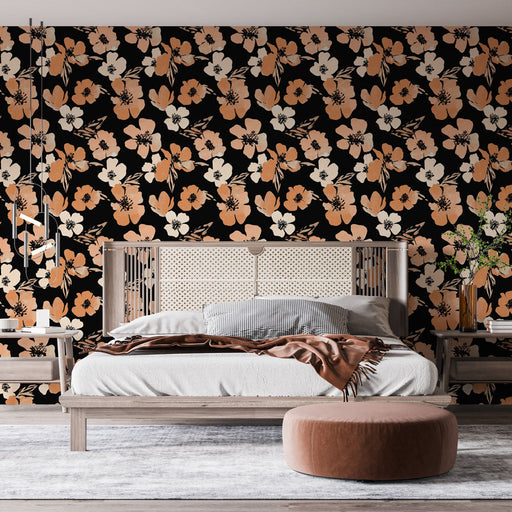 Тапетът представя съвременен и динамичен дизайн, комбинирайки модели на оранжеви цветя и флуидни черни форми на кремав фон. Живописните цветя добав...