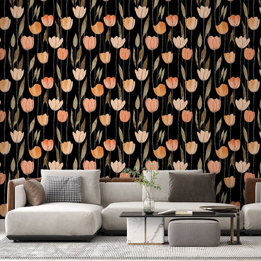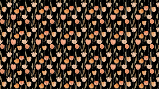 Тази тапет представя елегантен модел на цветни лалета, вариращ от прасковени и кремави нюанси, на шикозно черен фон. Фините детайли на листата и ст...