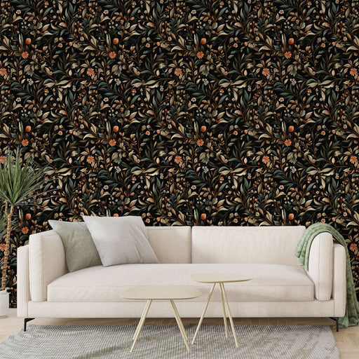 Тази красива тапета предизвиква усещане за тайнствен градински с цветна флорална шарка от дълбокозелени листа и нежни цветя в топли оттенъци на ора...