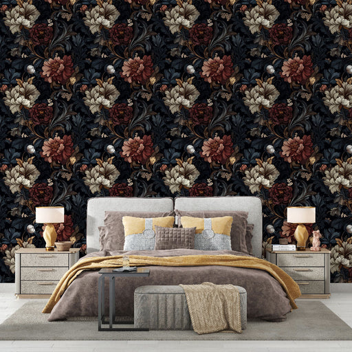 Тапетът с мурал представя красив модел на стилизирани цветя в топли нюанси на червено, оранжево и бежово, създавайки удивителен контраст срещу черн...