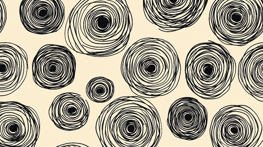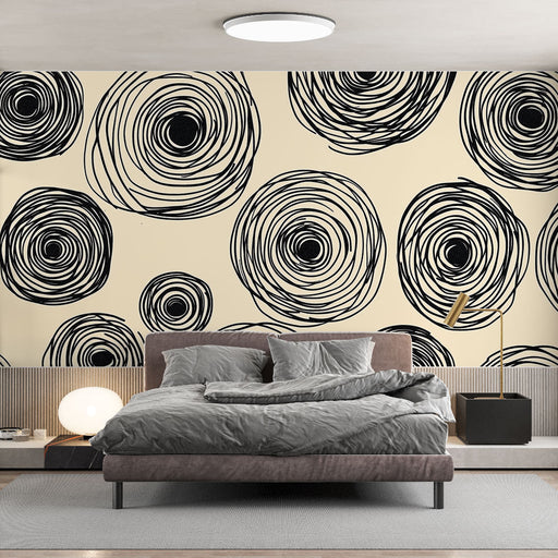 WonderMuralОткрийте нашата уникална тапетна фотография, представяща завладяващ модел на черни спирални на крем фон. Различните размери на кръговете създават д...