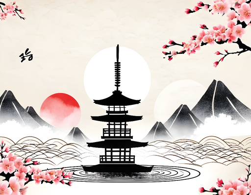 Art'loloТази японска тапета включва великолепна илюстрация на традиционна пагода, заобиколена от планини, стилизирани вълни и клони от вишнев цвят. Меките ...