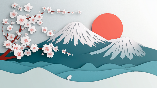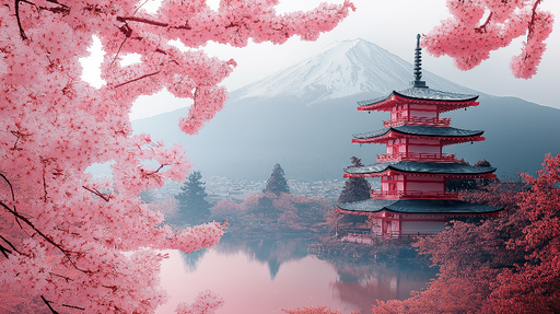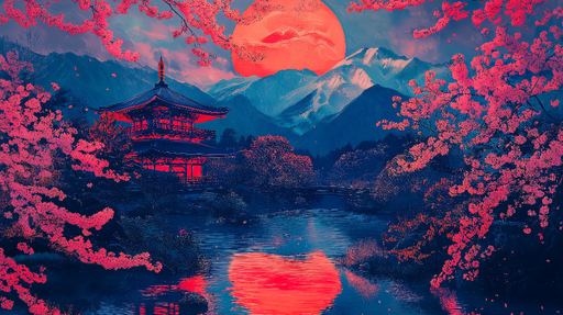 Simoko ArtПридайте на вашето пространство ново измерение с нашия японски тапет, който изобразява планината Фуджи и червено японско черешово дърво. Този впеча...