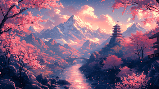 Прегледайте пълни подробностиЯпонски пейзаж тапет | Спокойна сцена с цъфтящи череши и пагода