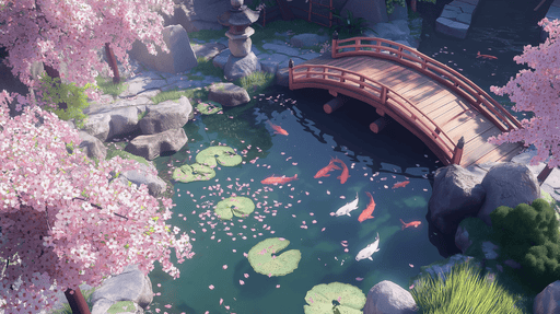Прегледайте пълни подробностиJapanese landscape with flowering cherry trees and colorful koi | Tapete peyzaj zen | Японски пейзаж с цъфтящи череши и шарени кой риби