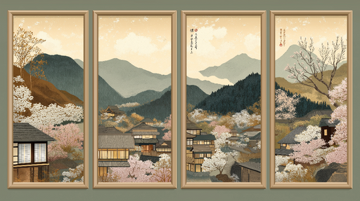 WonderMuralНашата тапета предизвиква спокоен японски пейзаж, където величествените планини заобикалят спокойно селце. Цветята на черешата добавят докосвания о...