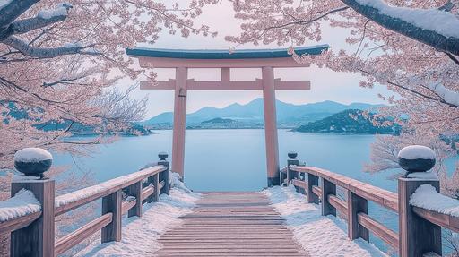 WonderMuralТази тапет улавя успокояващата красота на традиционен тории, обграден от деликатно оцветени черешови цветове. Зимният пейзаж, където снегът покрива...