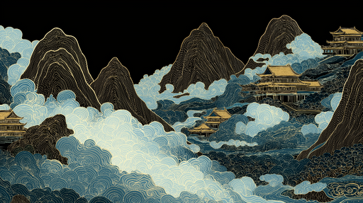 Прегледайте пълни подробностиТапет с азиатски пейзаж | Очарователни планини и стилизирани облаци