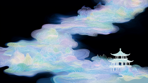 WonderMuralНашата тапета представя завладяващ модел на цветни облаци, около традиционни пагоди, всичко върху дълбок черен фон, който създава впечатляващ контр...