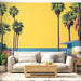 Открийте нашата жива фототапет, който улавя същността на слънчев ден на плажа. Този модел илюстрира пътека, обсадена с изобилие от палмови дървета, водеща към златист плаж, където цветни чадъри стоят на фин пясък. Яркият жълт фон предизвиква топлината на слънцето и създава весела и гостоприемна атмосфера.