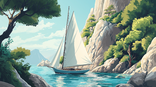 WonderMuralТази тапет предизвиква спокойна морска сцена, с платноходка, която спокойно плава в тюркоазени води, заобиколена от величествени скали и буйна раст...