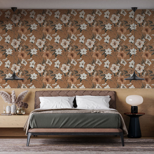 Прегледайте пълни подробностиЦветна цветна тапет | Стилизирани цветя в топли тонове на теракотен фон