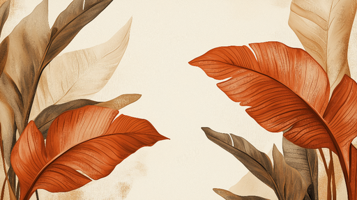 WonderMuralТази тапет с теракотени тонове представя изискан дизайн на големи тропически листа, комбинирайки топли нюанси на червено и оранжево с мек и неутрал...
