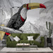 Тапетът подчертава красив екзотичен тукан с ярко перо, който седи на клон, заобиколен от детайлно стилизирано листва. Контрастът между черно-бялото оформление и докосванията от жълто и червено на тукана създава динамична и модерна атмосфера. Листата, също внимателно илюстрирани, придават усещане за дълбочина и текстура.