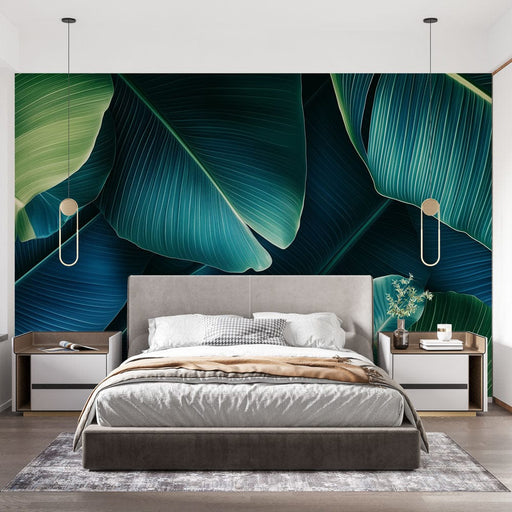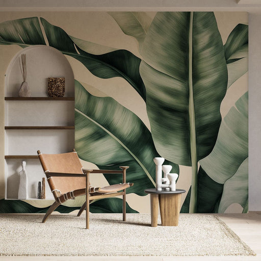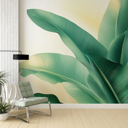 WonderMuralТози възхитителен тапет разполага с завладяващ мотив на бананови листа, нежно боядисани в оттенъци на зелено и злато, създавайки хармоничен и успок...