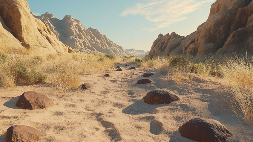 Прегледайте пълни подробностиСтенопис тапет пустинен пейзаж | Пясъчен път, заобиколен от скали и растителност