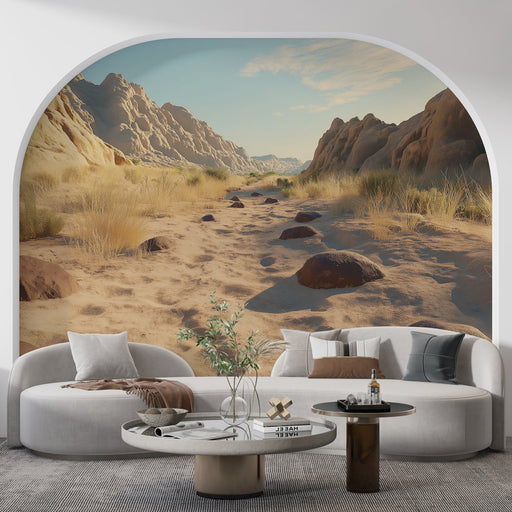 WonderMuralТази стенна тапет изобразява великолепен пуст пейзаж, където пясъчна пътека се вие през високи скали. Оттенъците на пясък и земя създават естествен...