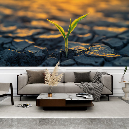 Прегледайте пълни подробностиМурален тапет пустинен пейзаж | Младо растение върху напукана почва