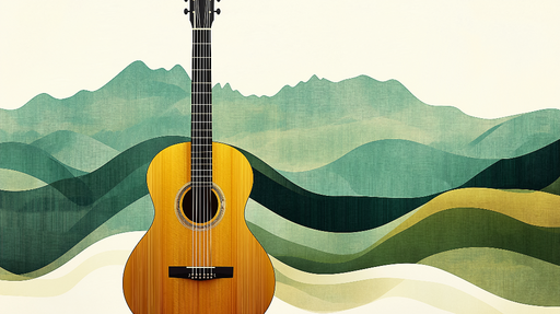 WonderMuralТази артистична тапет е украсена с елегантна акустична китара, поставена на фона на стилизирани планини в успокояващи нюанси на зелено и жълто. Мод...