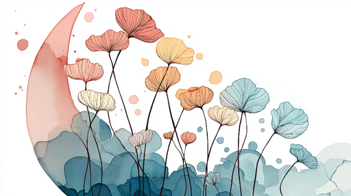 WonderMuralОткрийте нашата елегантна тапета с мурал, представяща деликатни цветя, илюстрирани с акварел, красиво издигащи се срещу лунна форма. Оттенъците на ...