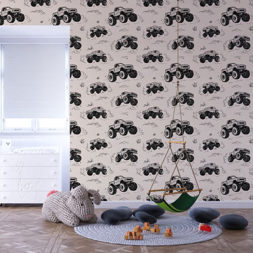 WonderMuralТапетът с този очарователен мурал показва винтидж стил на чудовищни камиони, изобразени с впечатляващи детайли върху мек бежов фон. Превозните сред...