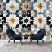 Тази тапета включва модел от звездни плочки в различни цветове, включително нюанси на синьо, зелено, черно и златно. Комплексните геометрични форми създават носталгична атмосфера и добавят артистичен щрих към вашия интериор.