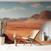 Тази стенописна тапета предизвиква зашеметяващ пейзаж на пустиня, където пясъчните дюни и величествените скални образувания се сливат в градиент от оранжеви нюанси. Топлата и успокояваща атмосфера на пустинята създава уникална обстановка, приканваща към размисъл и бягство.