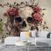 Тази смела тапет улавя естетика, която е едновременно тъмна и романтична, с череп, заобиколен от пищни червени рози, излизащ от кремав фон. Внимателно нарисуваните детайли на черепа, комбинирани с розите в пълен разцвет, създават перфектна симбиоза между живота и смъртта, символизирайки ефимерна красота.