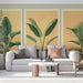 Тапетът представя красива композиция от тропически листа, внимателно илюстрирани на мек фон в пастелни тонове. Живите зелени тонове на листата хармонично контрастират с топлия фон, създавайки жива и уютна атмосфера.