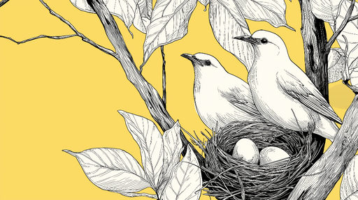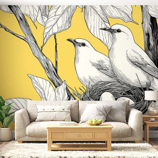 WonderMuralThis mural wallpaper features a beautiful illustration of two birds delicately drawn in a nest, surrounded by stylized leaves on a bright yellow ba...