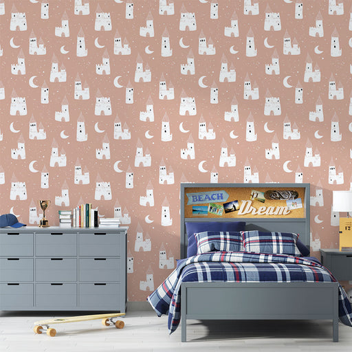 WonderMuralThis adorable Mural Wallpaper features a playful pattern of white castles on a soft pink background, adorned with crescent moons. The delicate deta...