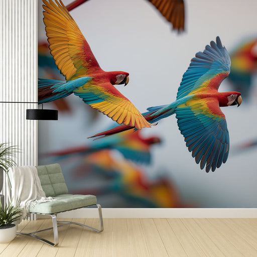 WonderMuralDiscover our wallpaper featuring colorful parrots dancing in the air. This captivating design showcases vibrant shades of red, blue, yellow, and gr...