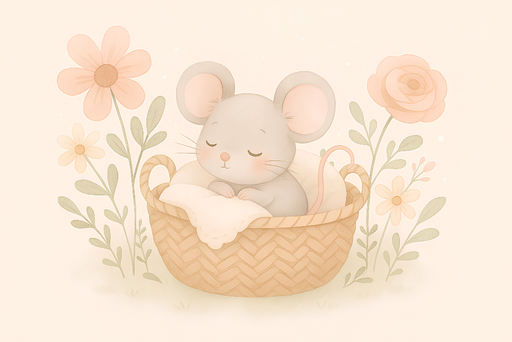WonderMuralThis enchanting mural wallpaper features a sleeping mouse nestled in a cozy basket, surrounded by pastel flowers and soft foliage. The delicate sha...