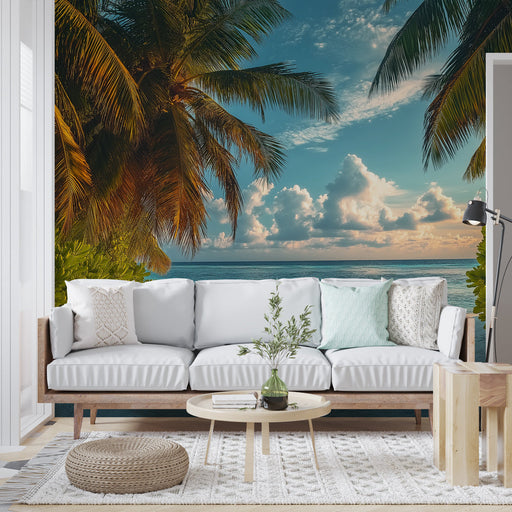 WonderMuralThis mural wallpaper evokes a magnificent tropical beach with majestic palm trees standing against a backdrop of an azure blue sky dotted with ligh...