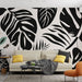 This mural wallpaper features a modern design with bold leaf patterns in black and white, offering a striking contrast on a light background. The fluid lines and geometric shapes of the leaves add a contemporary and artistic touch to your interior spaces.