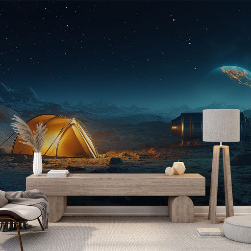 Ideal for outdoor enthusiasts and those who wish to bring a rustic touch to their interior, it integrates perfectly into spaces like a living room, bedroom, or veranda. This mural wallpaper can also inspire decoration themes about camping and nature getaways.