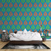 This mural wallpaper feather pattern features a vibrant design with green and orange feather patterns on a bright blue background. Perfect for adding a touch of color and originality to any room in your home.