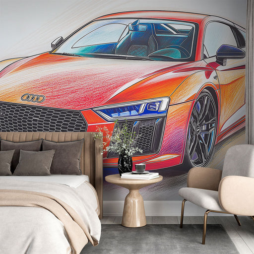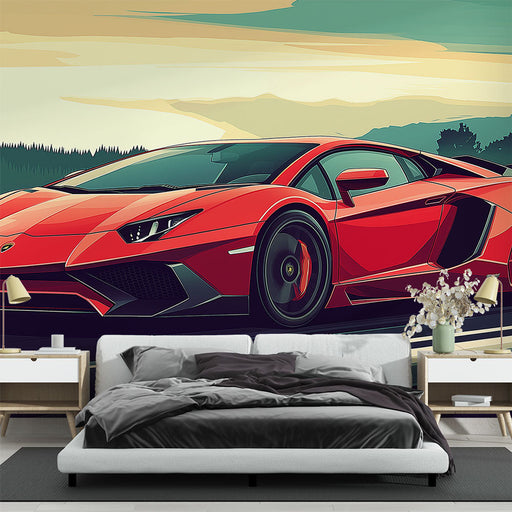 WonderMuralThis captivating illustration features a sports car with bold lines and modern design, showcasing a bright red hue paired with colorful graphic det...