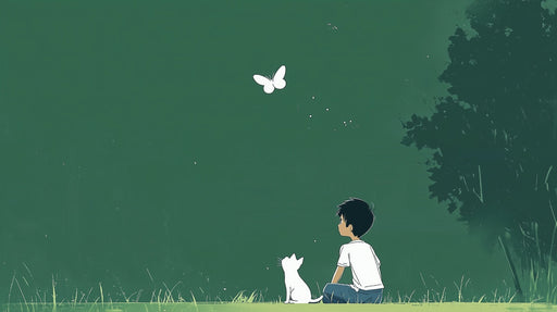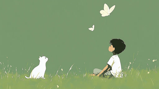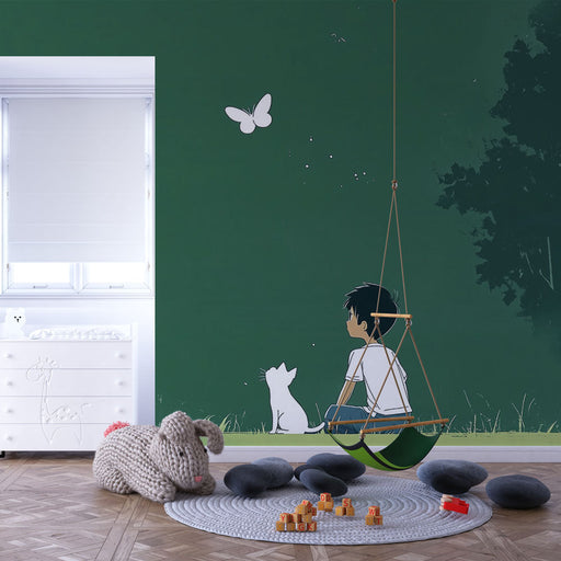 Art'loloThis Mural Wallpaper nature and innocence captures a peaceful moment where a child and a cat observe a butterfly under a vast green sky. Perfect fo...